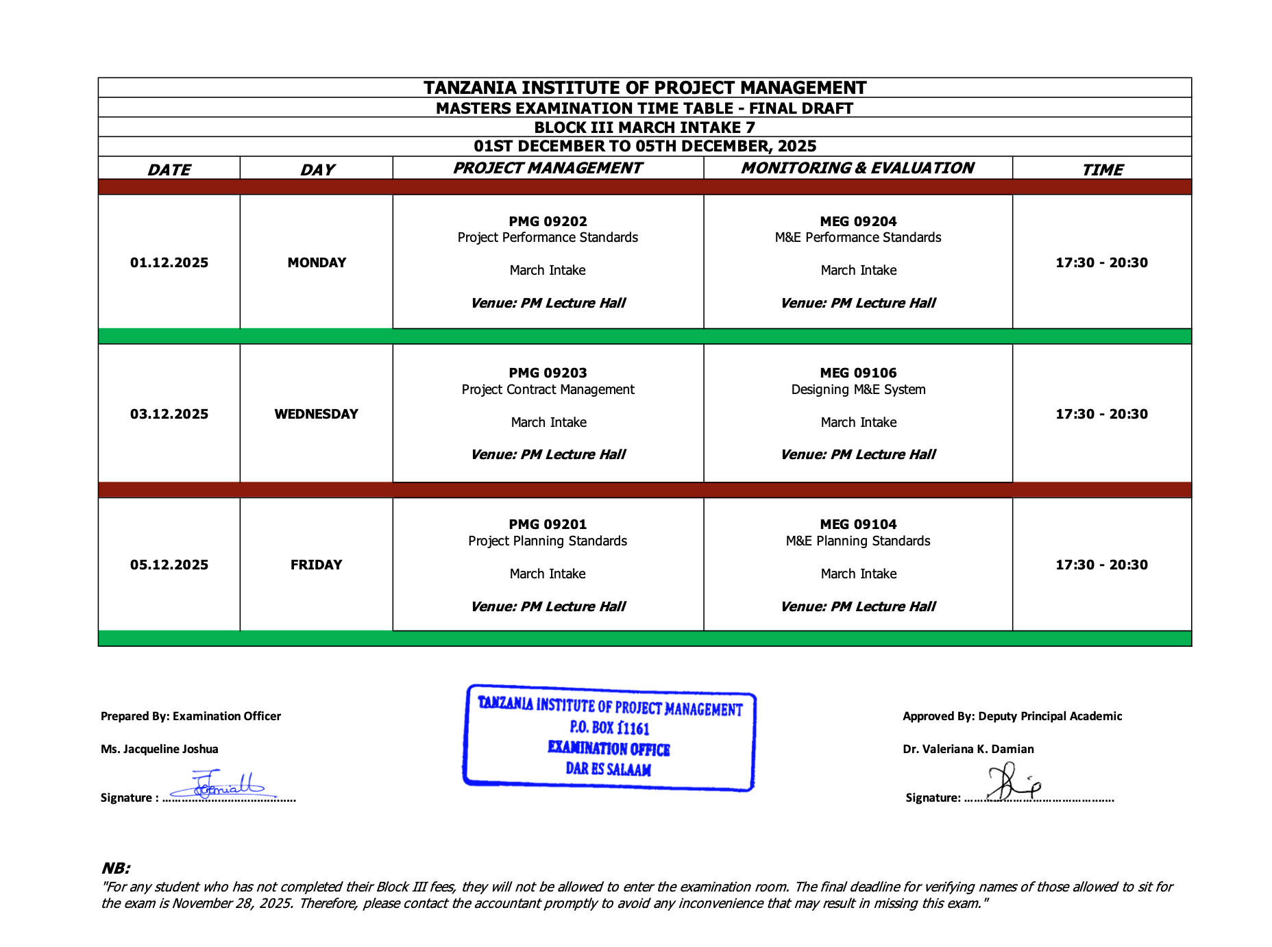 Masters Examination Time Table March Block III Intake 7, 2025/2026