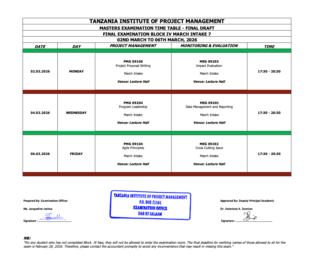 Masters Examination Time Table March Block IV Intake 7, 2025/2026