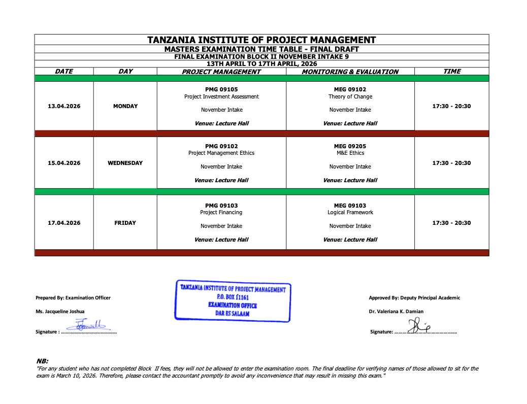Masters Examination Time Table November Block II Intake 9, 2025/2026
