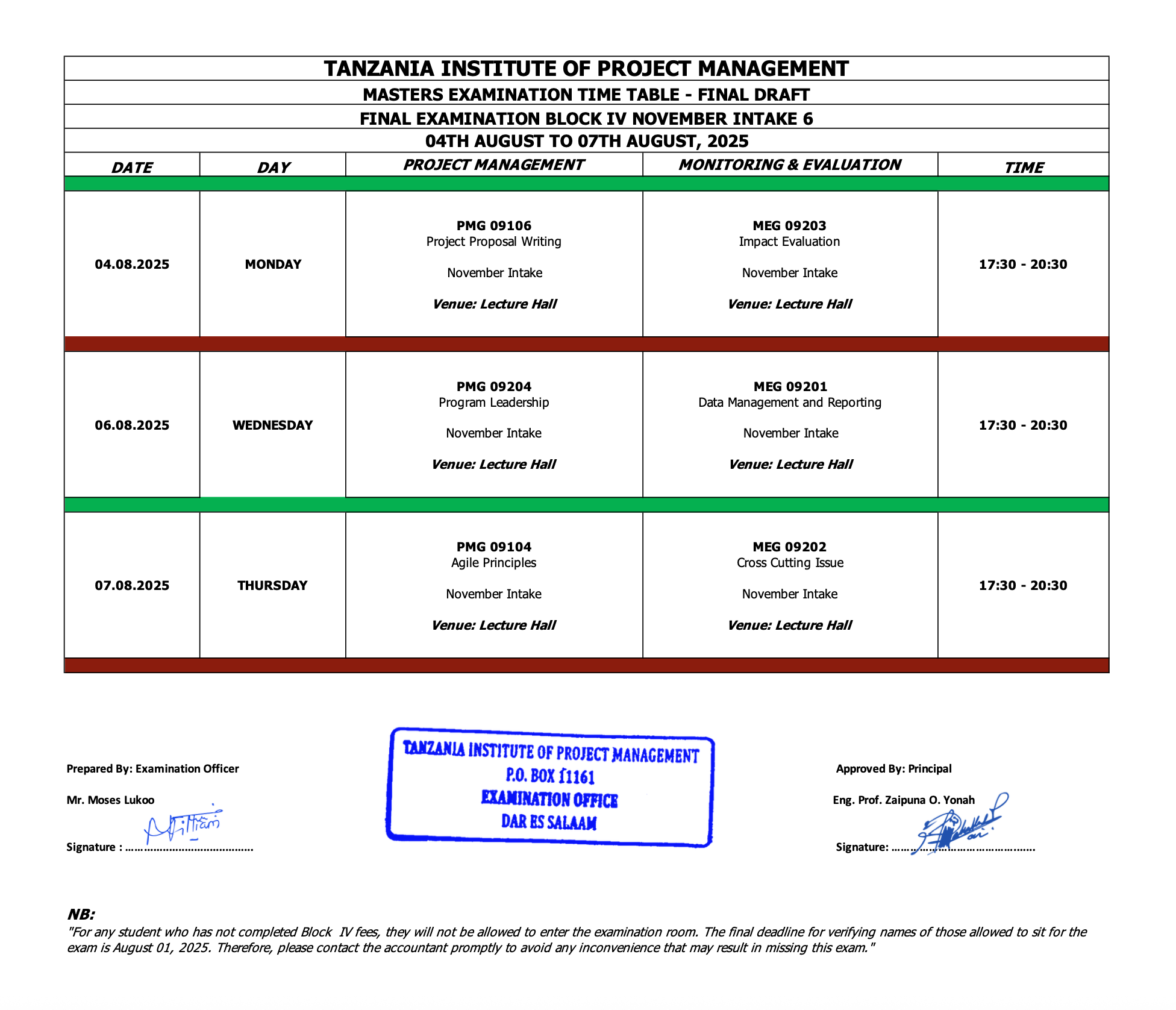 Masters Examination Time Table November Block IV Intake 6, 2024/2025